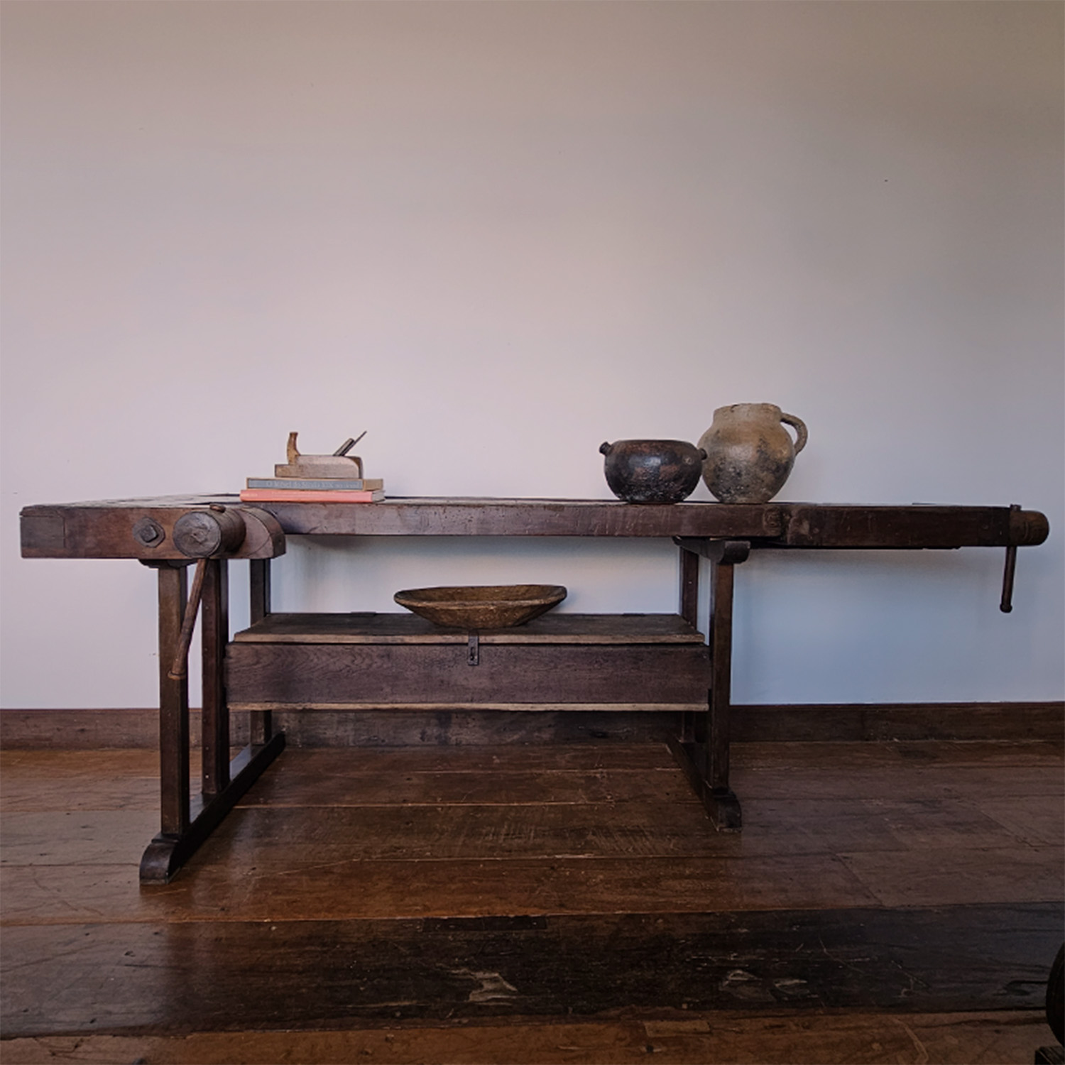 Descubra o charme rústico desta autêntica bancada de marceneiro dos anos 50, meticulosamente construída em madeira robusta.