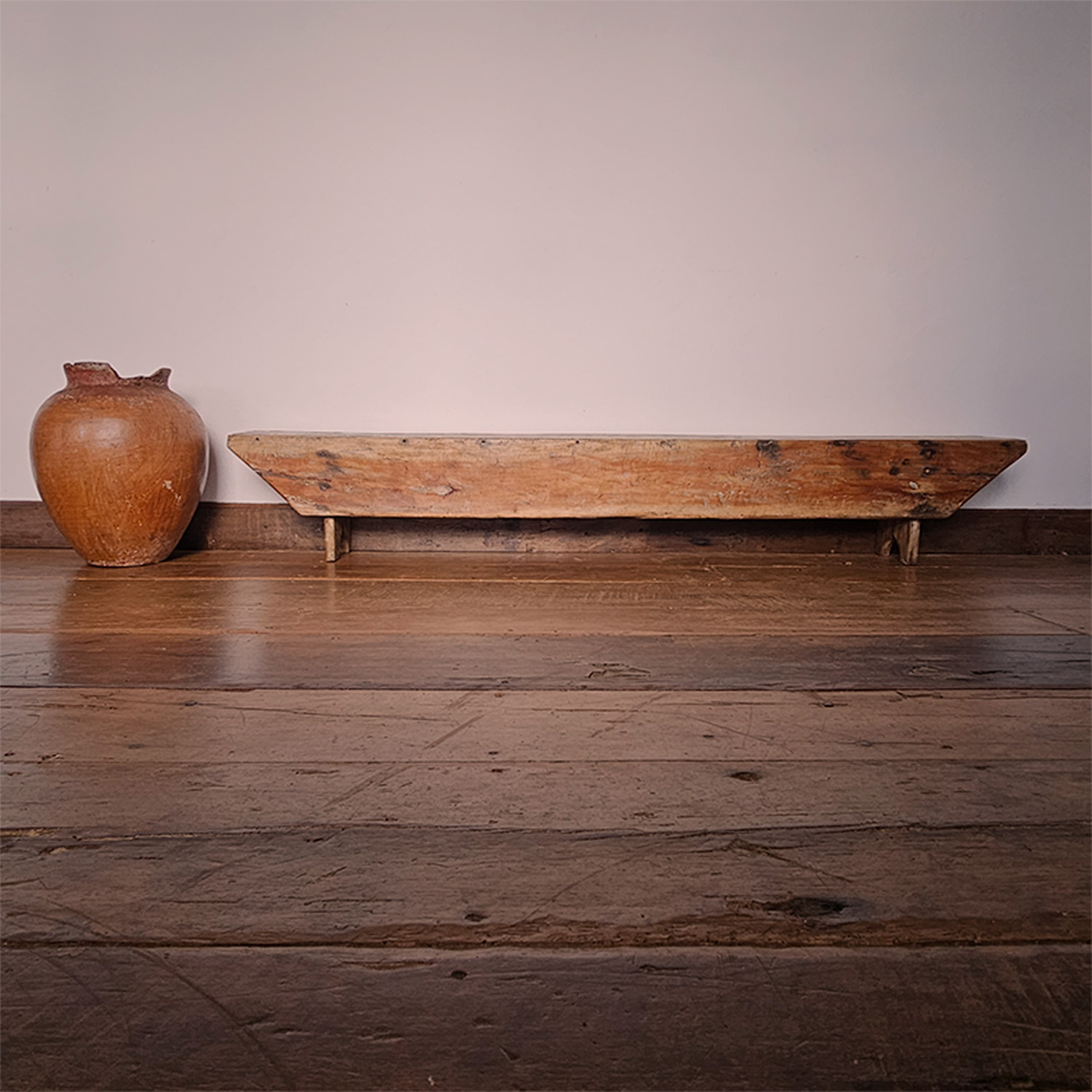 Banco baixo autêntico, resgatado do mobiliário utilitário rural. Construído em madeira maciça de tonalidade quente, este banco exibe a beleza das marcas do tempo, que atestam sua história e autenticidade.