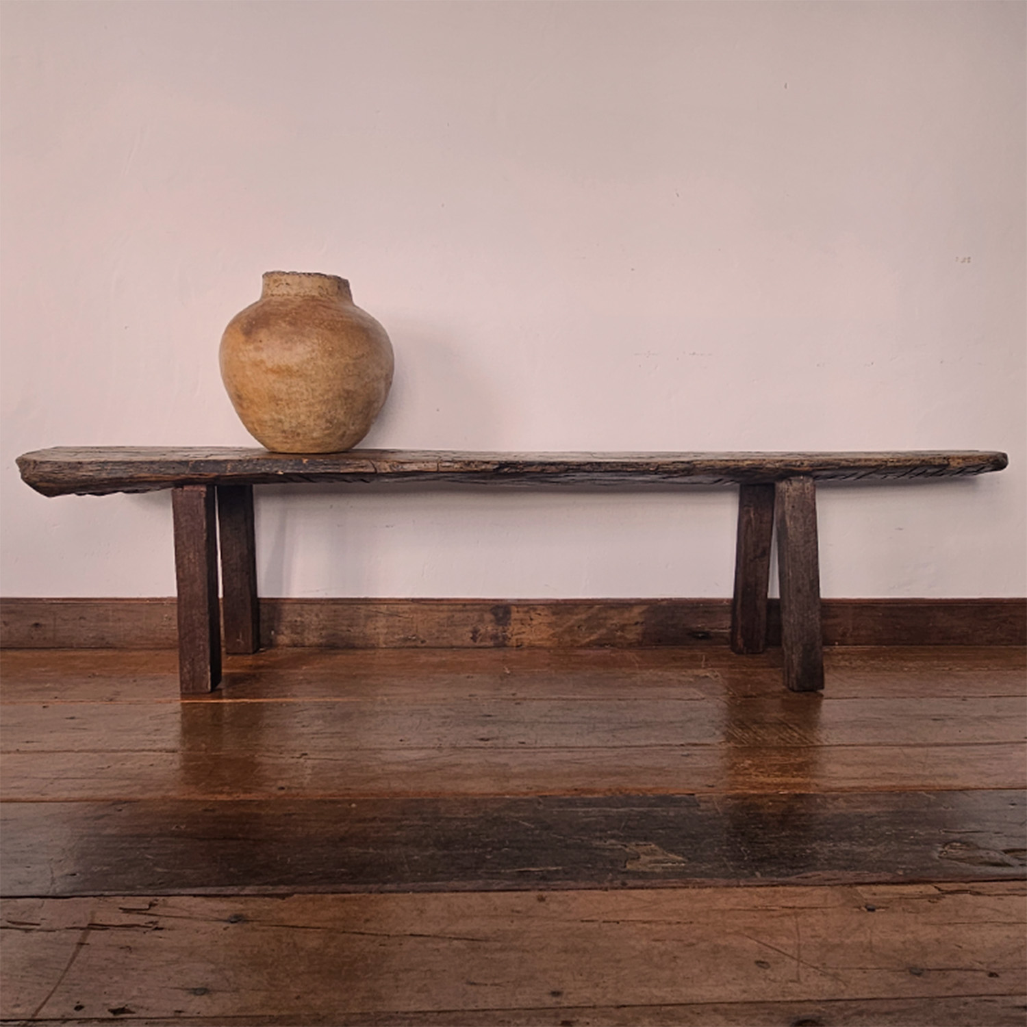 Banco rústico original de Minas Gerais, datado do início do século XX, confeccionado inteiramente em madeira maciça.