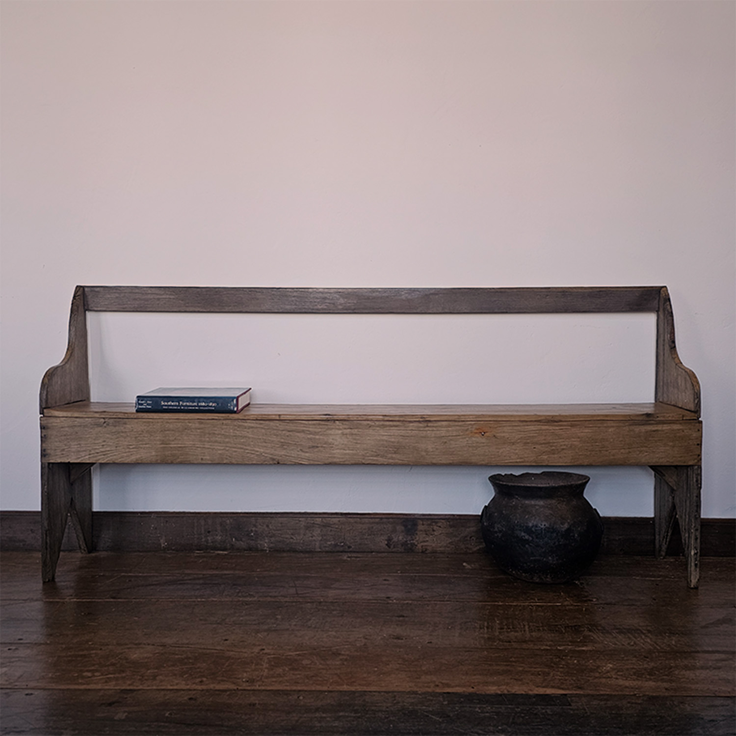 Construído em madeira maciça, exibe uma estrutura robusta com assento alongado e um encosto discreto que valoriza sua simplicidade.