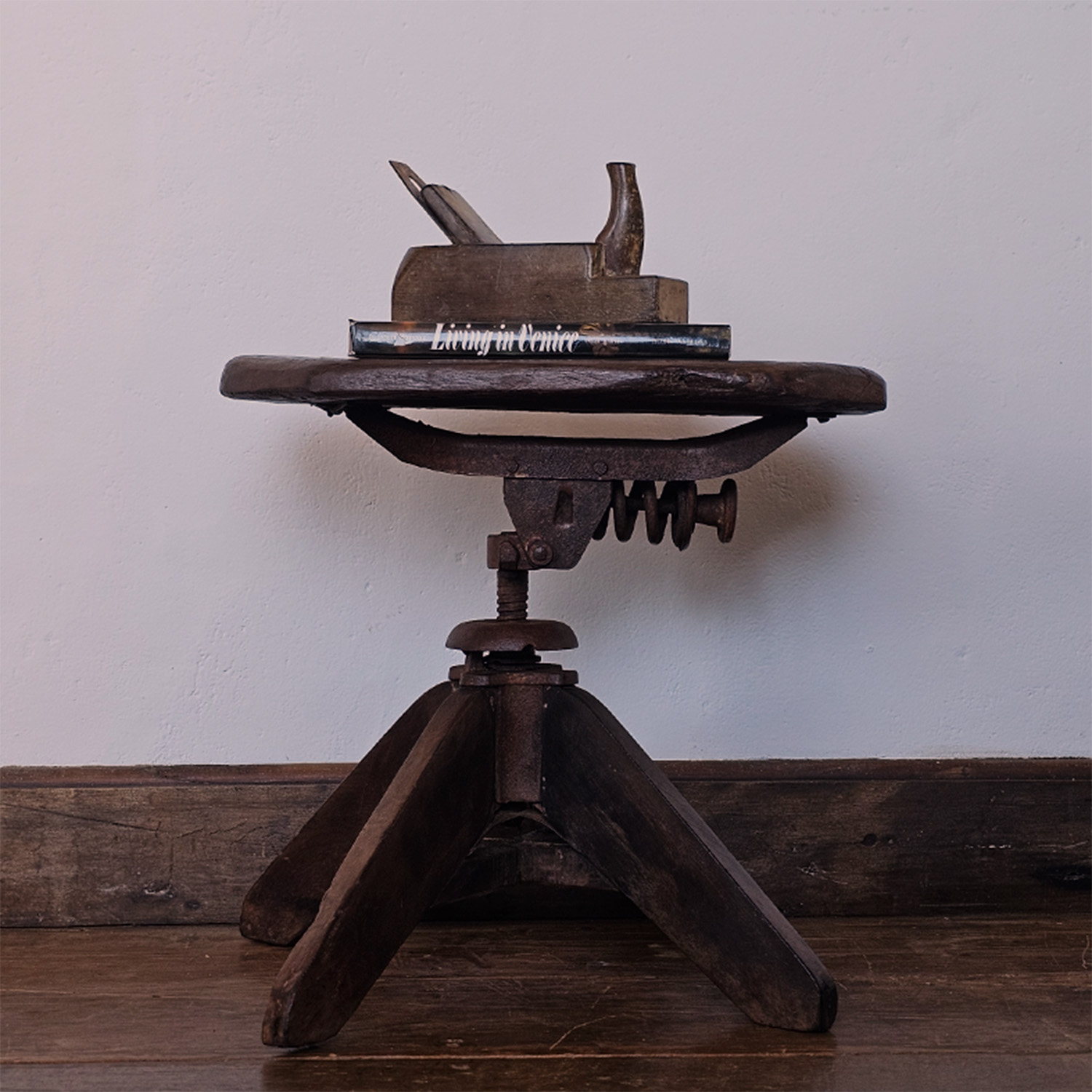 Banqueta de sapateiro autêntica, resgatada do mobiliário artesanal dos anos 50.