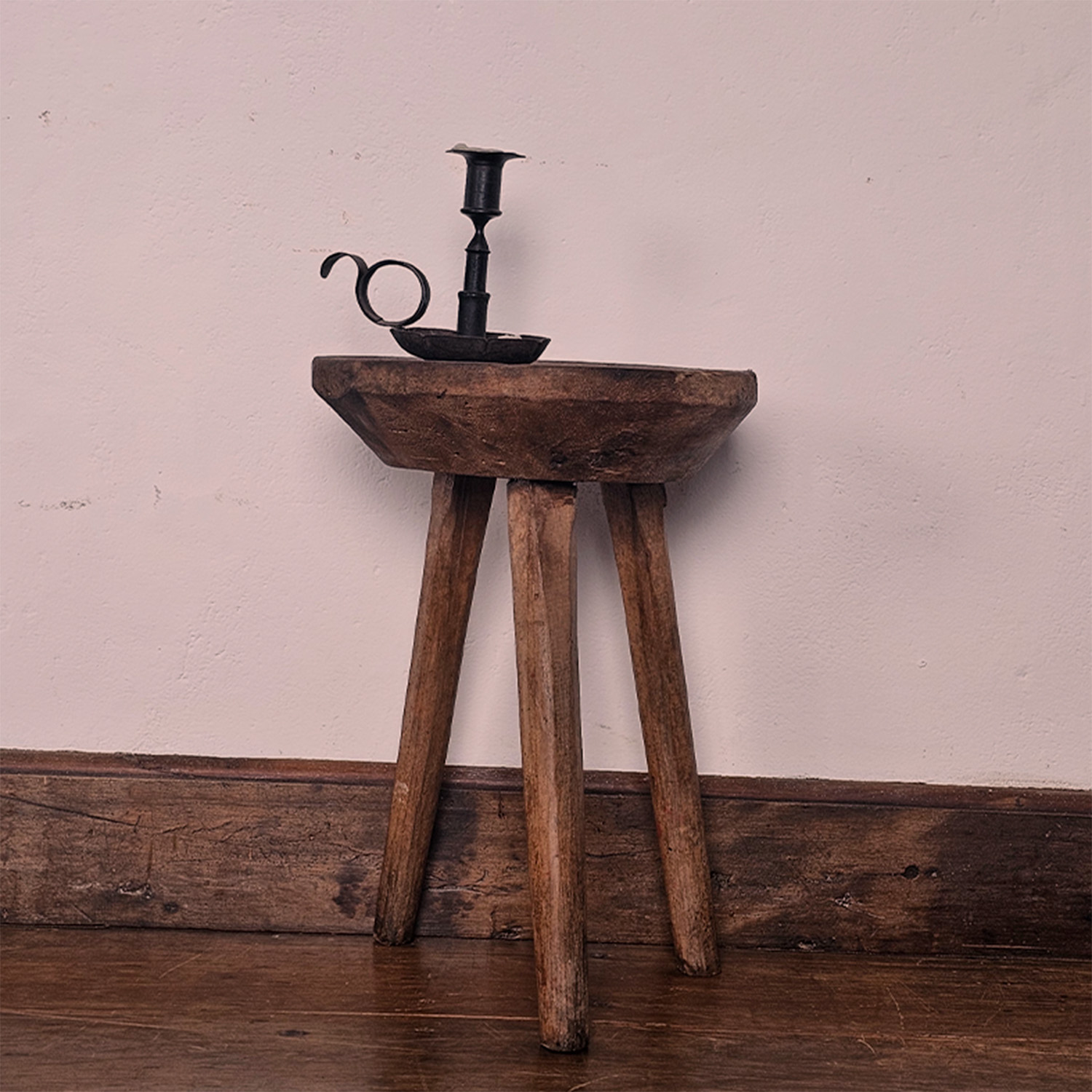Seu design apresenta um assento circular elegantemente equilibrado por três pés torneados, que conferem charme e estabilidade.