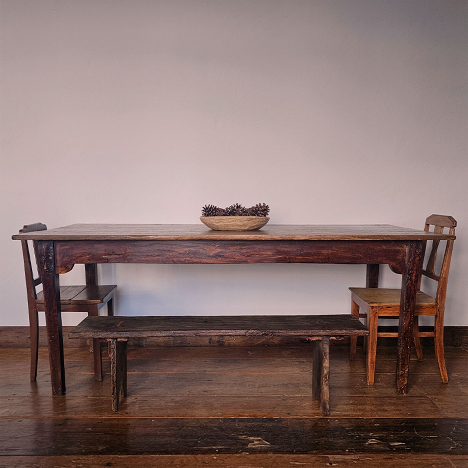 Mesa rústica autêntica da década de 1950, com um charmoso abaulamento em uma das extremidades, conferindo-lhe um caráter único.