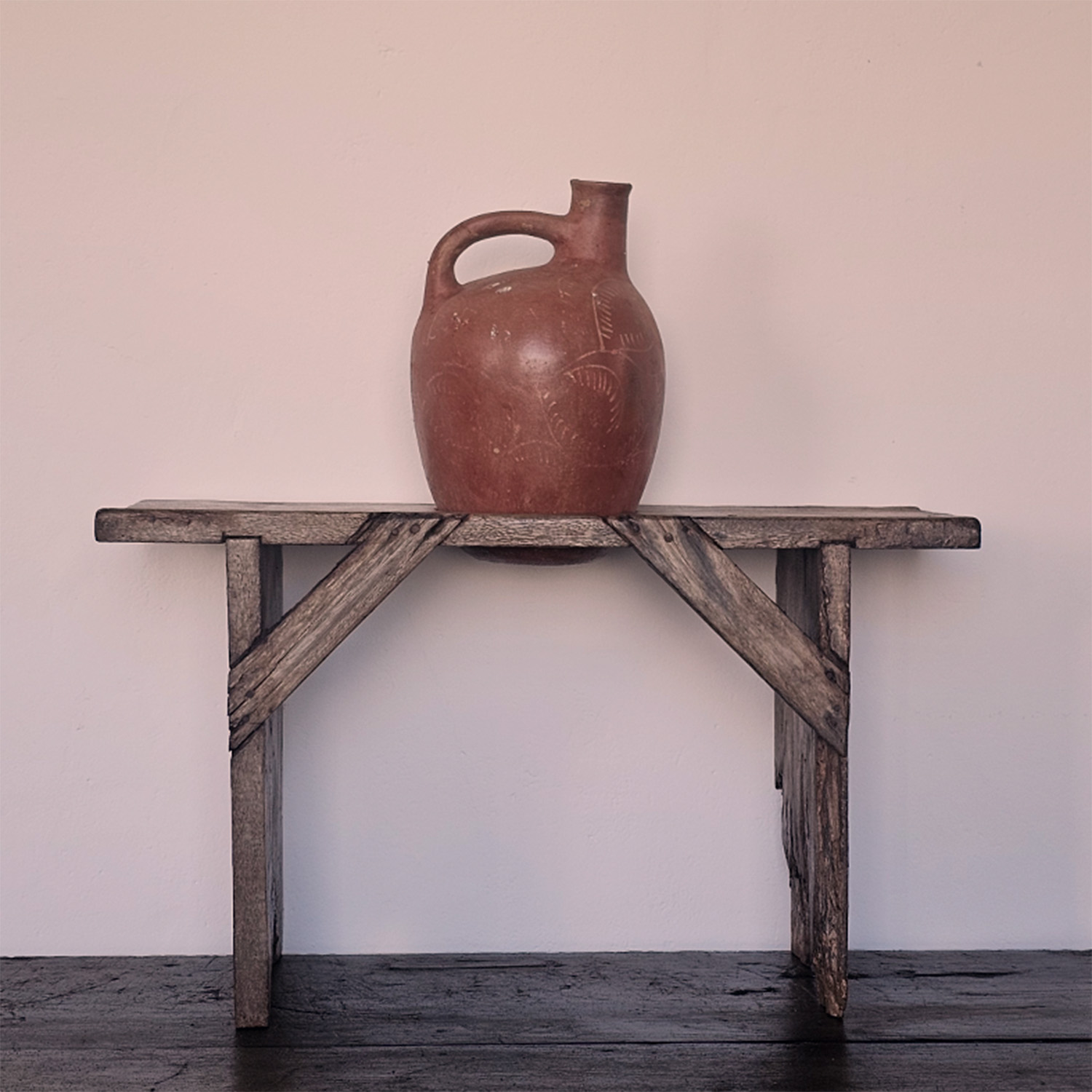 Porta-bilhas autêntico em madeira maciça, datado da década de 1930, originalmente utilizado para apoiar bilhas (potes) de água fresca.
